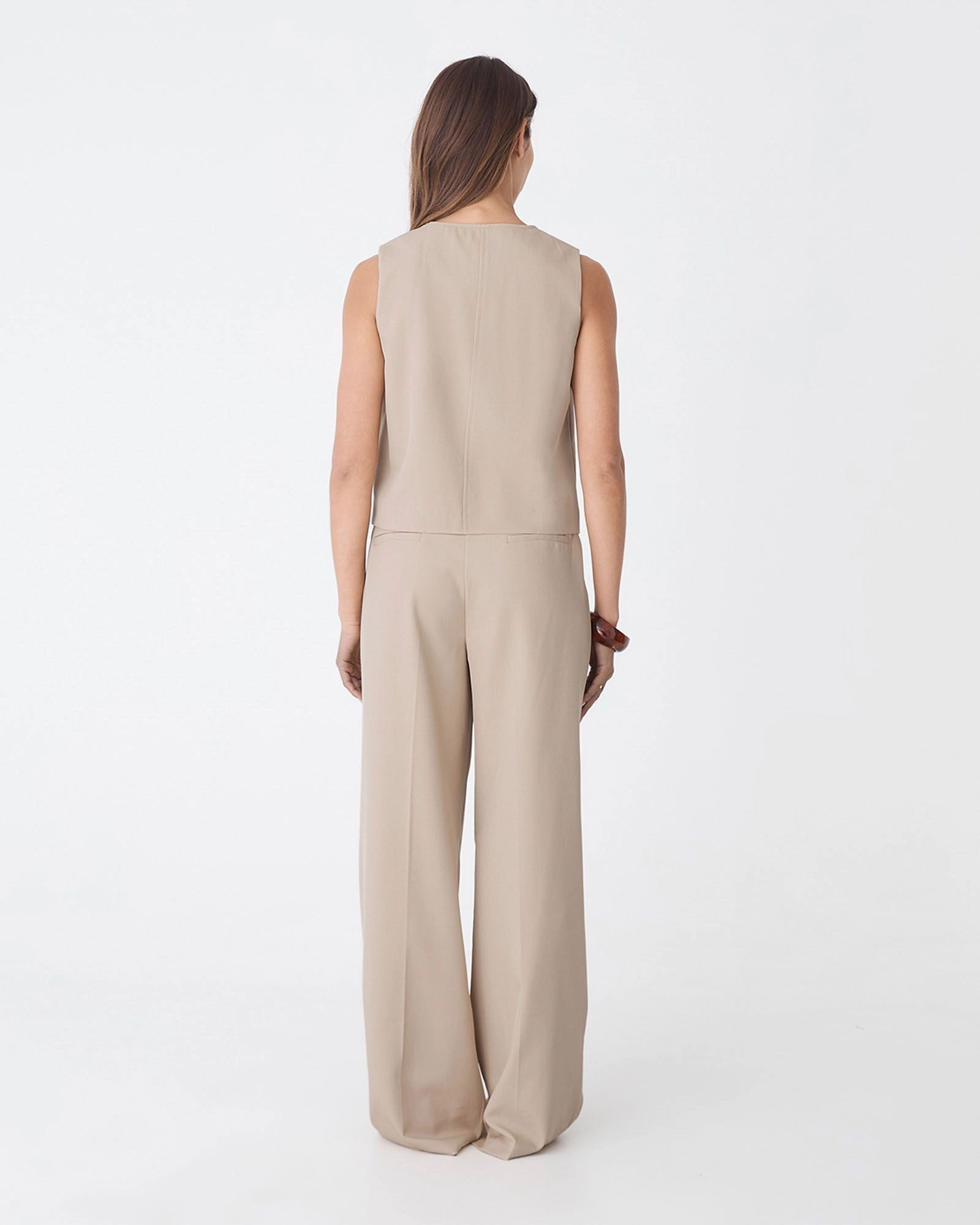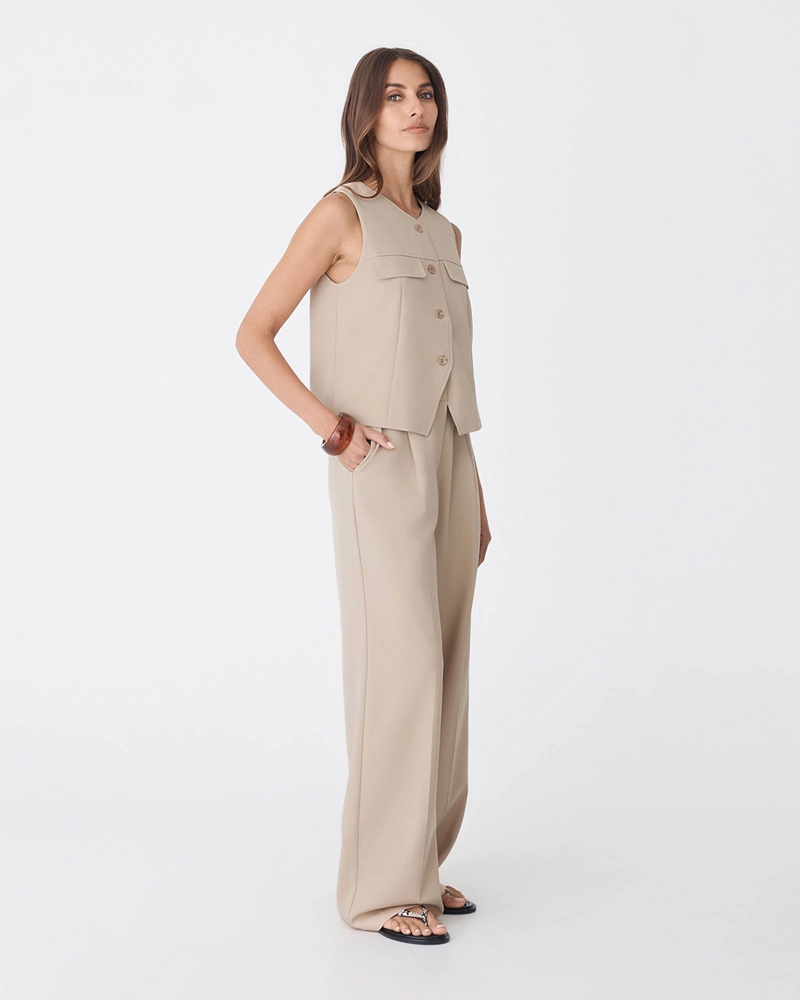 The Abel Relaxed Pocket Vest is your go-to vest for effortless layering and modern utility. Designed from smooth, structured fabric in a timeless beige hue, it features a relaxed fit, V-neckline, and front faux pockets with flaps. Finished with clean seam detailing and a button-front closure, it pairs with the matching pants or it can be styled with denim, mini skirts and shorts.