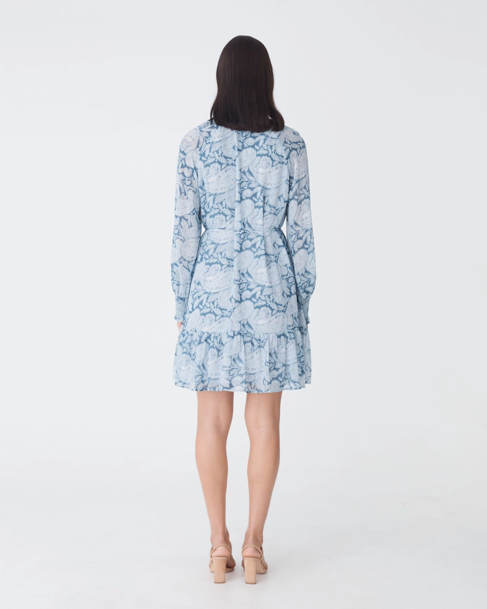 The Angie Long Sleeve Dress exudes charm in a timeless blue-and-white paisley print. With a ruffled stand collar, a statement V-neckline, voluminous long sleeves, and a matching waist tie, the dress offers fluid drape and effortless all-day wear. Style with neutral accessories to complete your look.