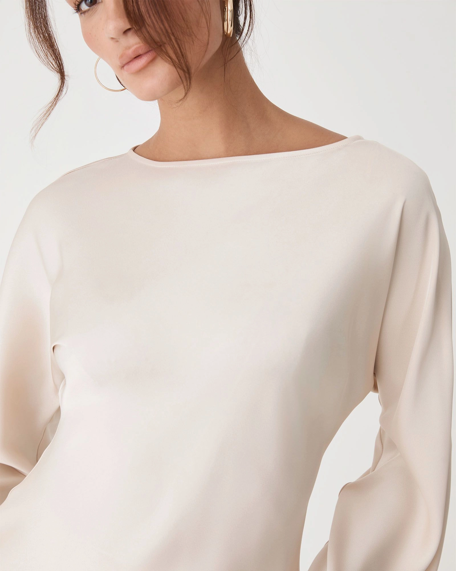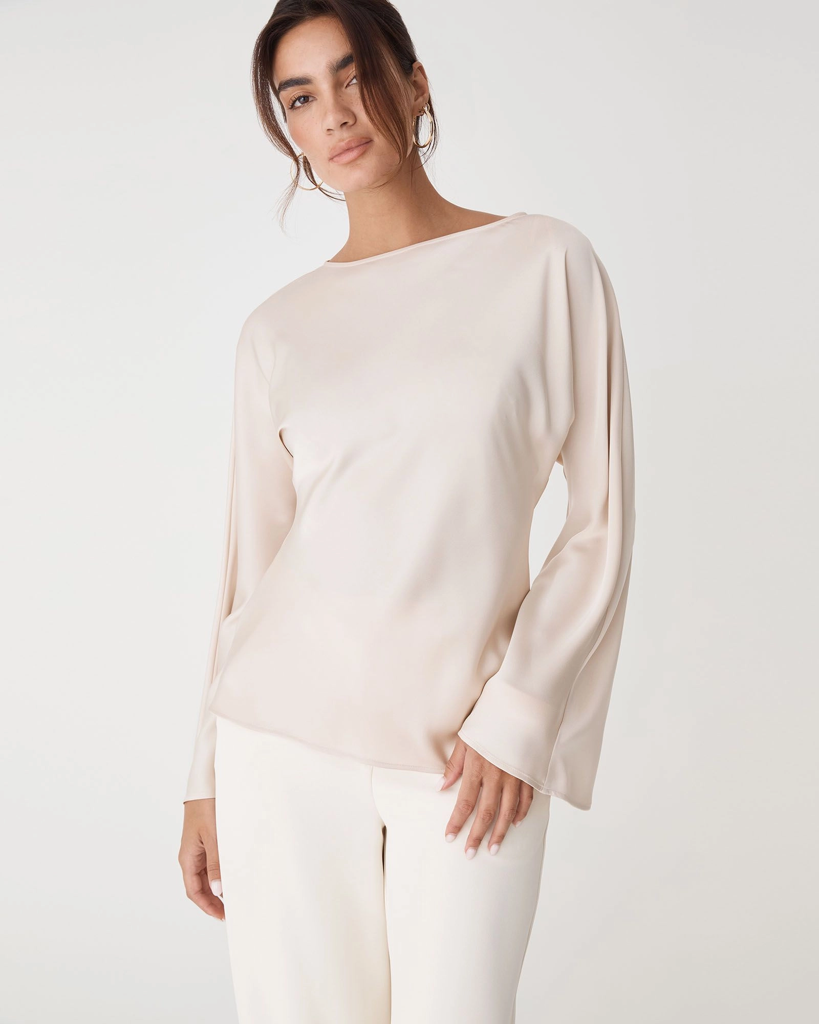 Fluid and elegant, the Asma Satin Bias Cut Top offers a chic, modest silhouette with a relaxed, hip-length fit. Featuring a boat neckline, long flared sleeves and side hem splits for subtle detail. Designed in a lustrous satin, it pairs with the Asma Satin Wide Leg Pants for a matching set.