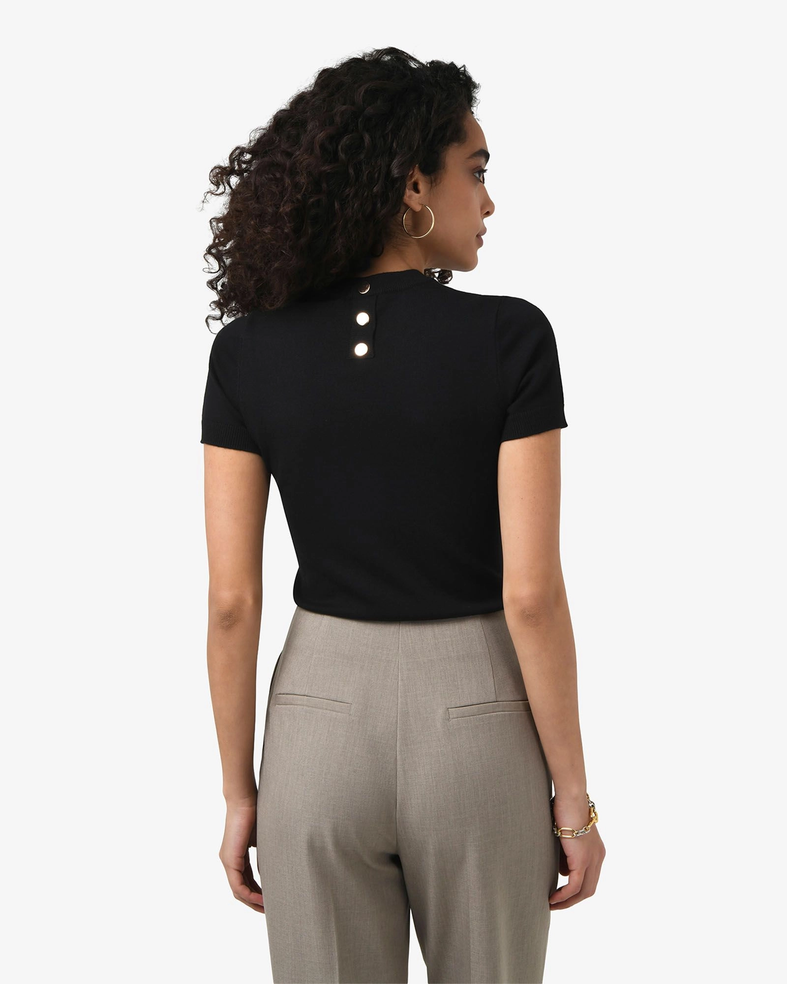 - Back neck gold-tone button detail