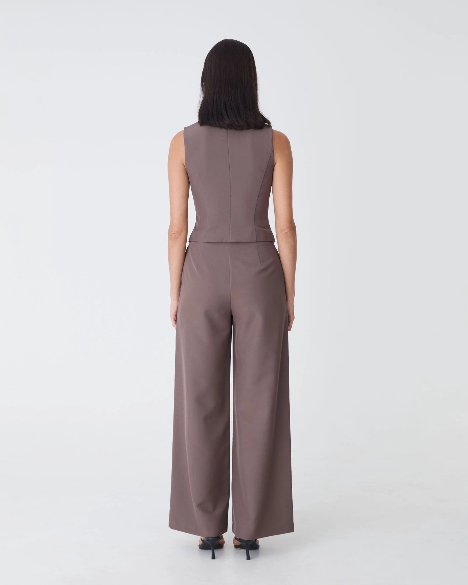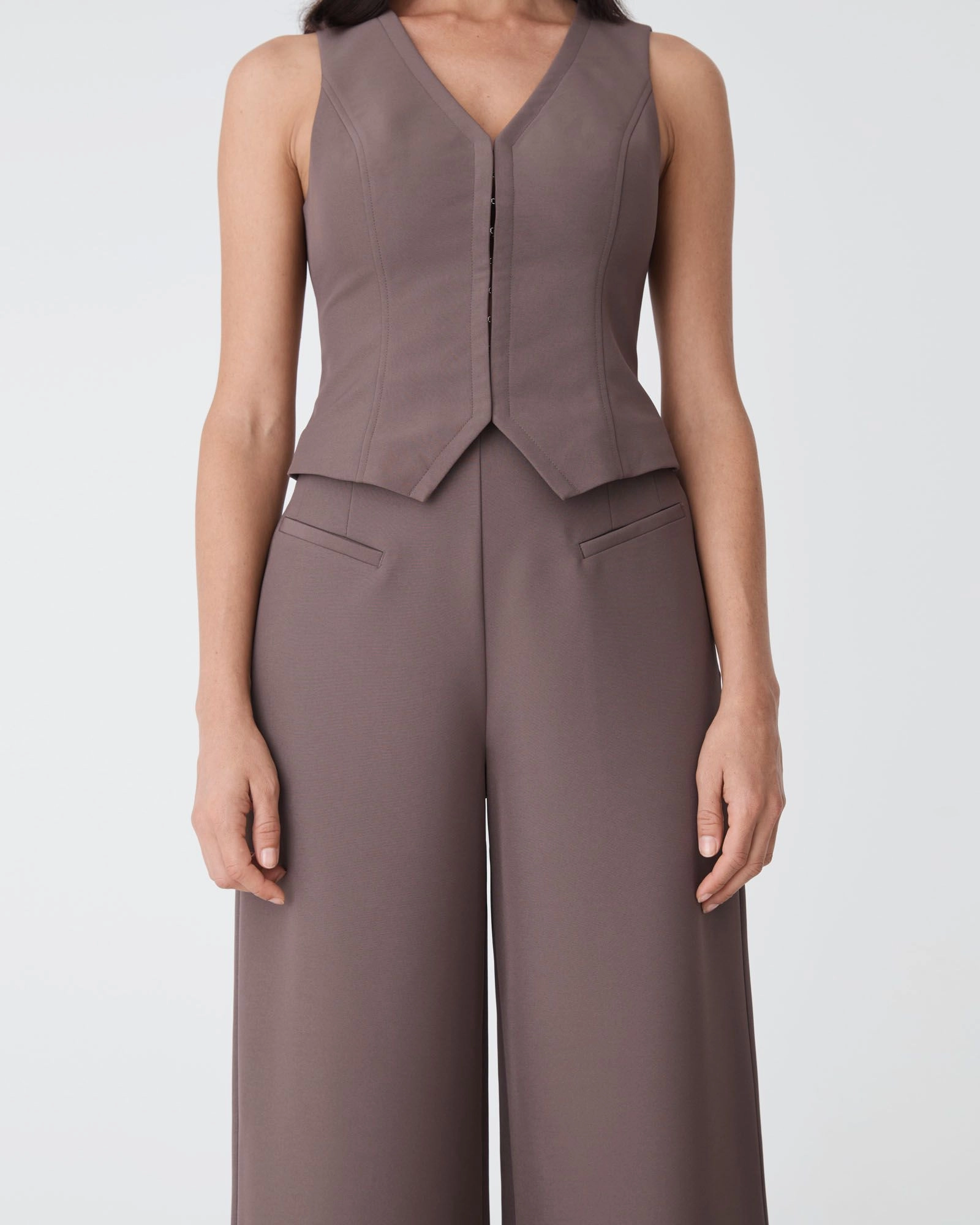 The Dakota V-Neck Vest is tailored for a modern finish. Designed with a sharp V-neckline, sculpting seams, and a sleek hook-and-eye front closure, it creates a flattering, waist-defining silhouette. The pointed hem adds structure, making it easy to style with the matching Dakota Basque Waist Pants or can be worn alone or layered over a shirt for a complete look.