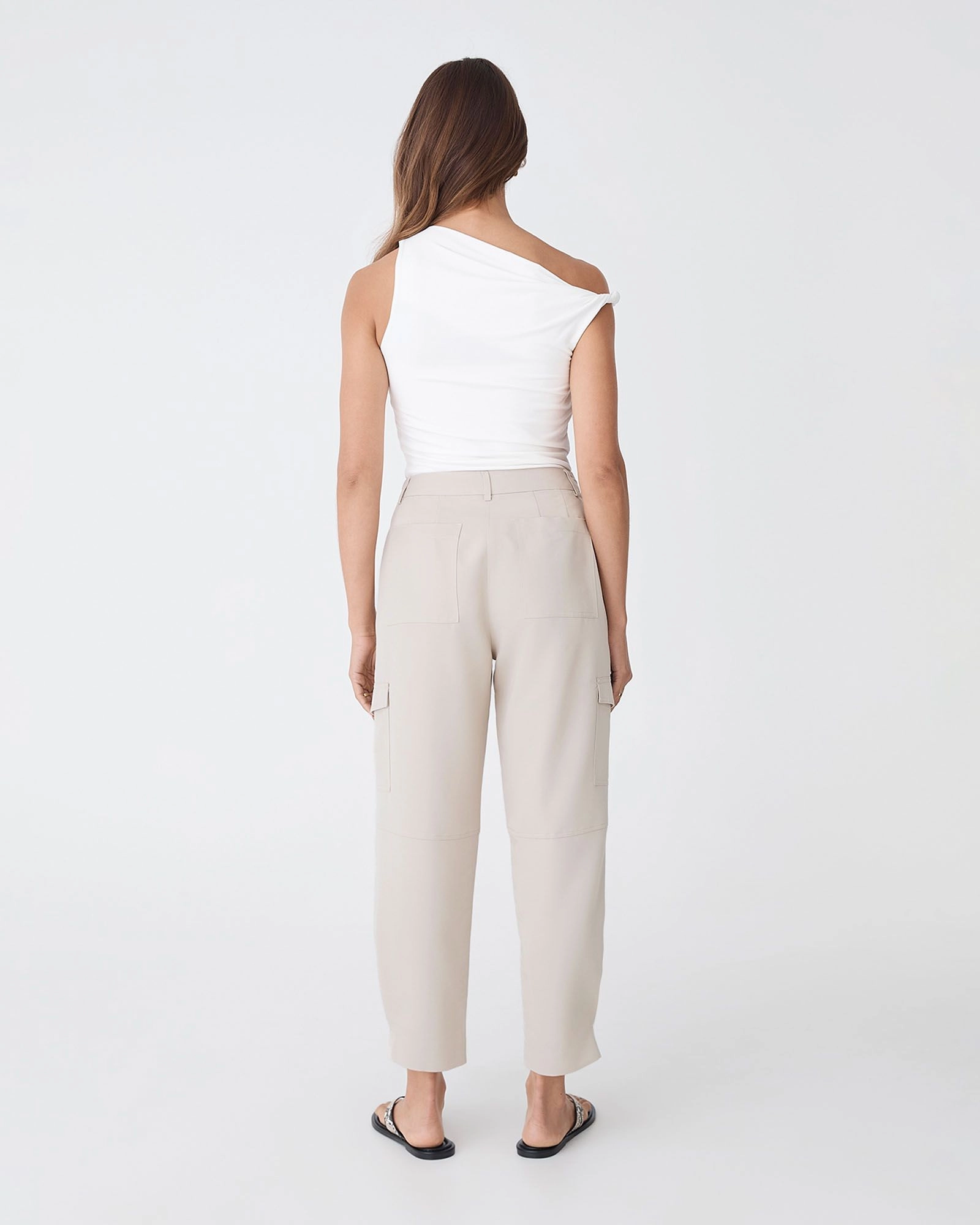 The Emiko Cargo Pants combine utility and tailored style. Designed with a mid to high-rise fit, tapered cuffs, and side cargo pockets, the pants can be styled with a basic shirt or fitted tank top for an effortless look.