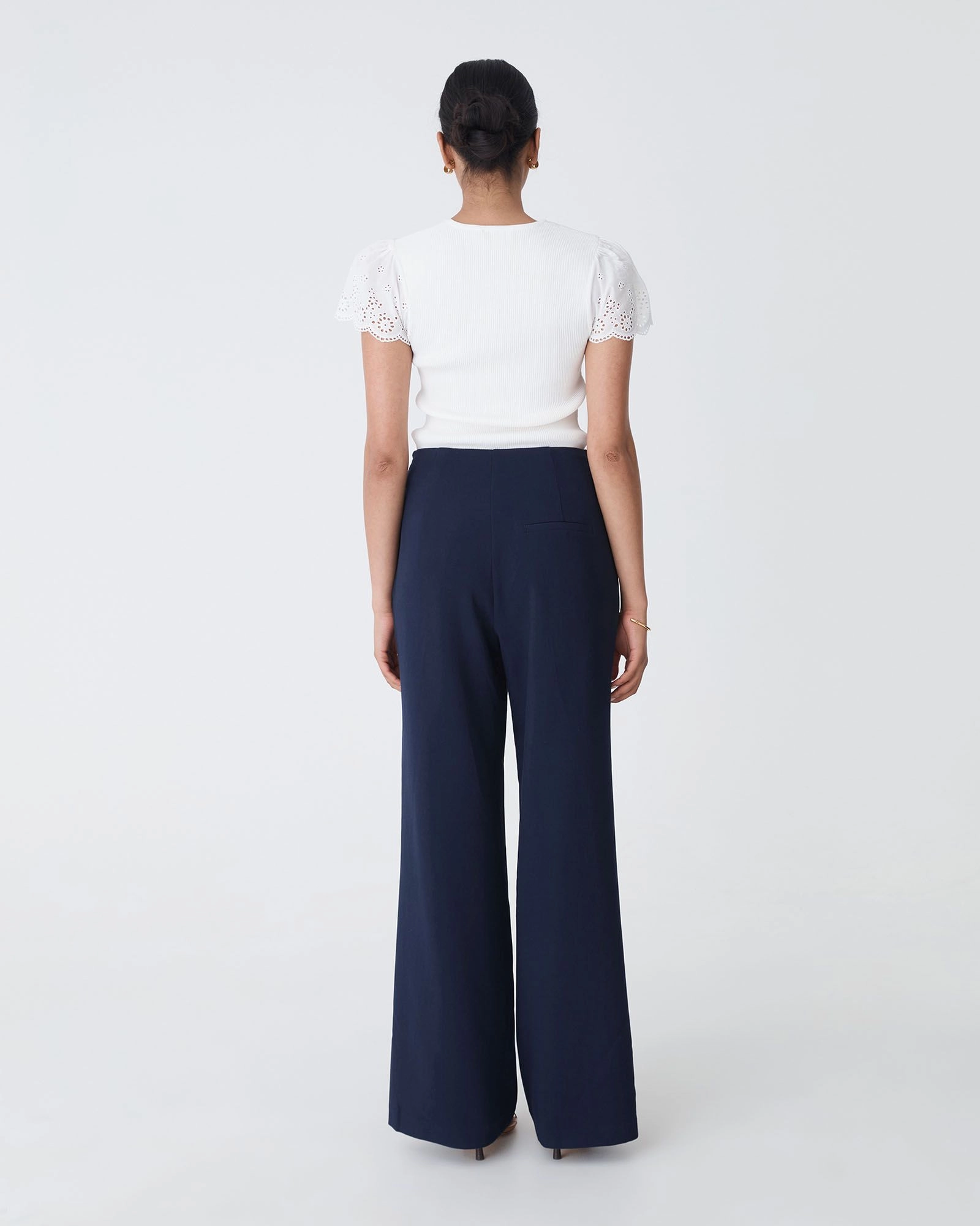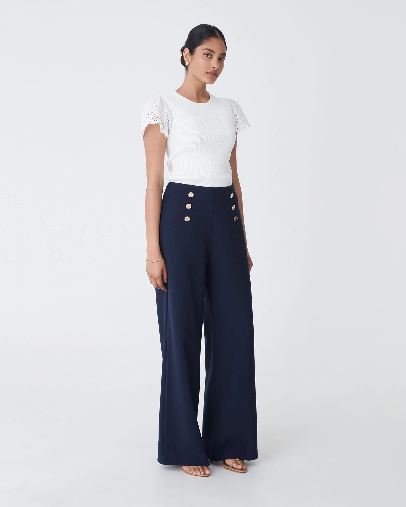 The Evie Wide Leg Sailor Pants feature a flattering high-rise waist with gold-tone button detailing and a flowing straight, wide-leg silhouette. Designed to elongate the figure, they offer a clean, tailored look that works effortlessly from office to evening. Perfect with a tucked-in blouse, or a fitted knit top.