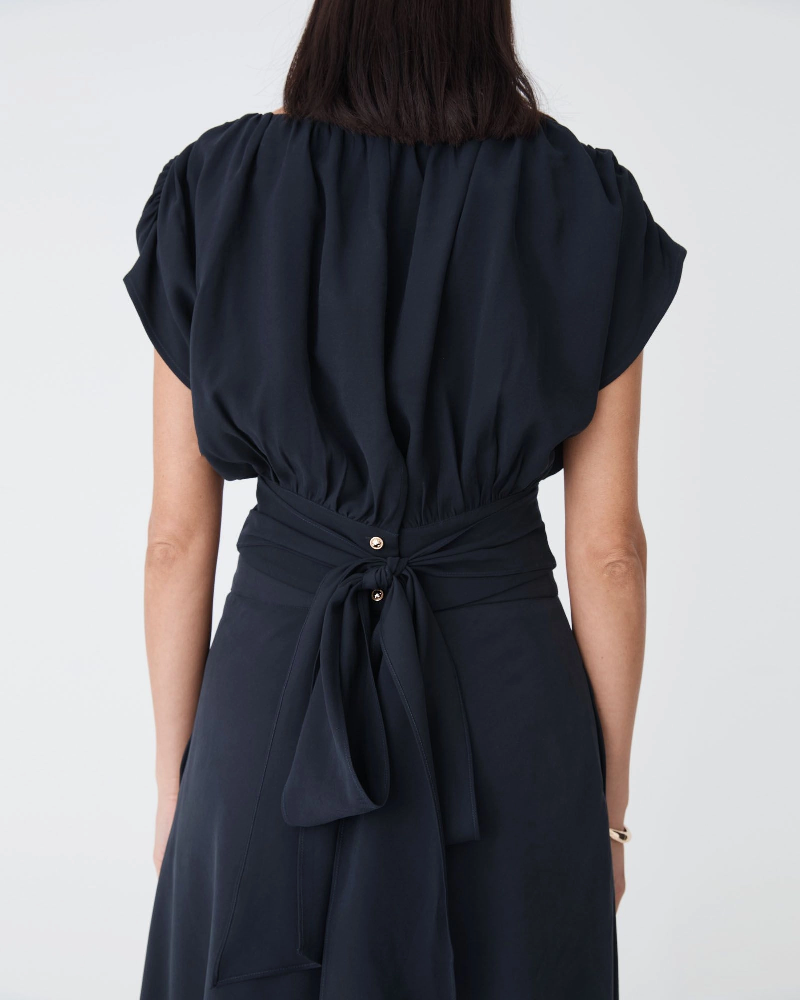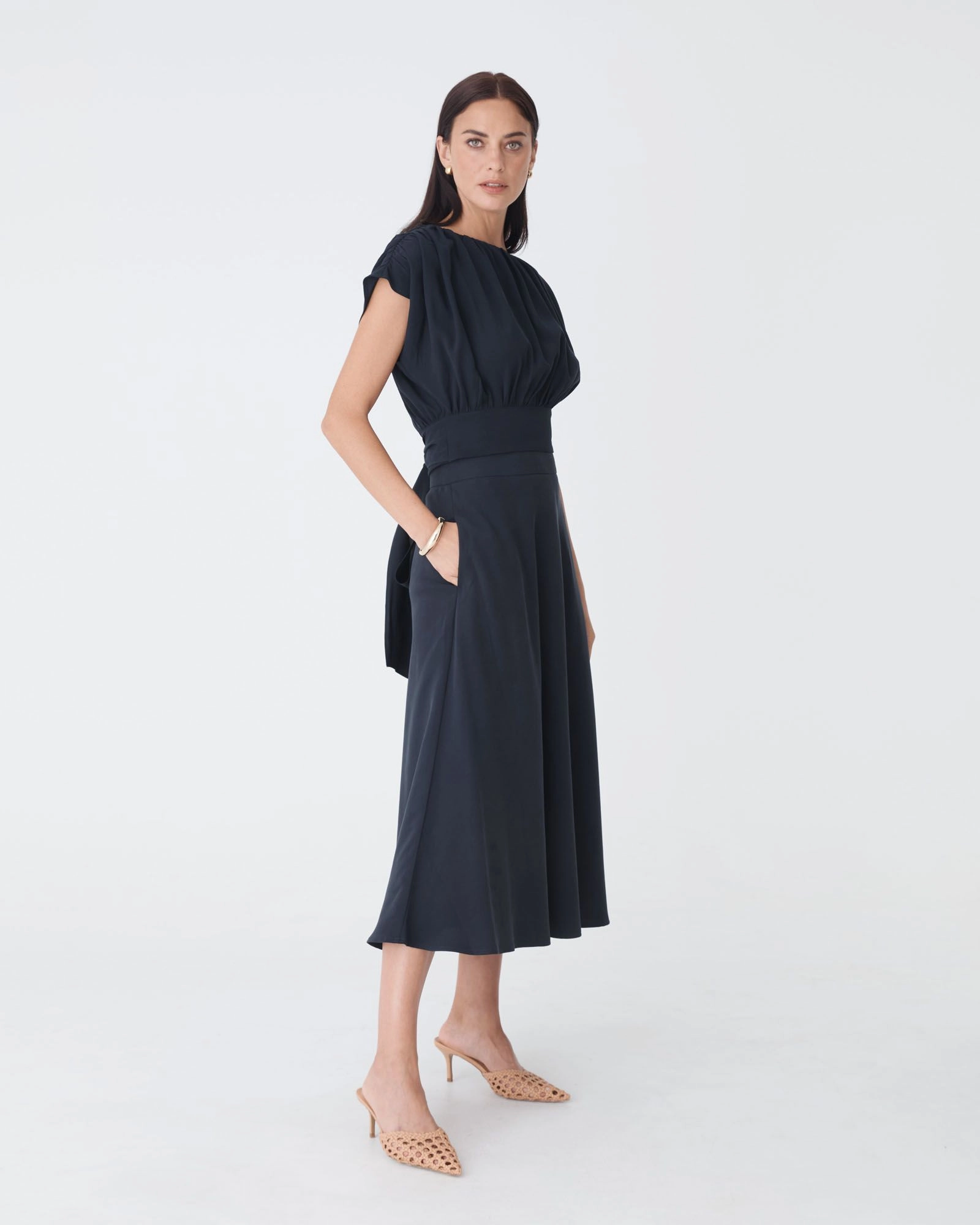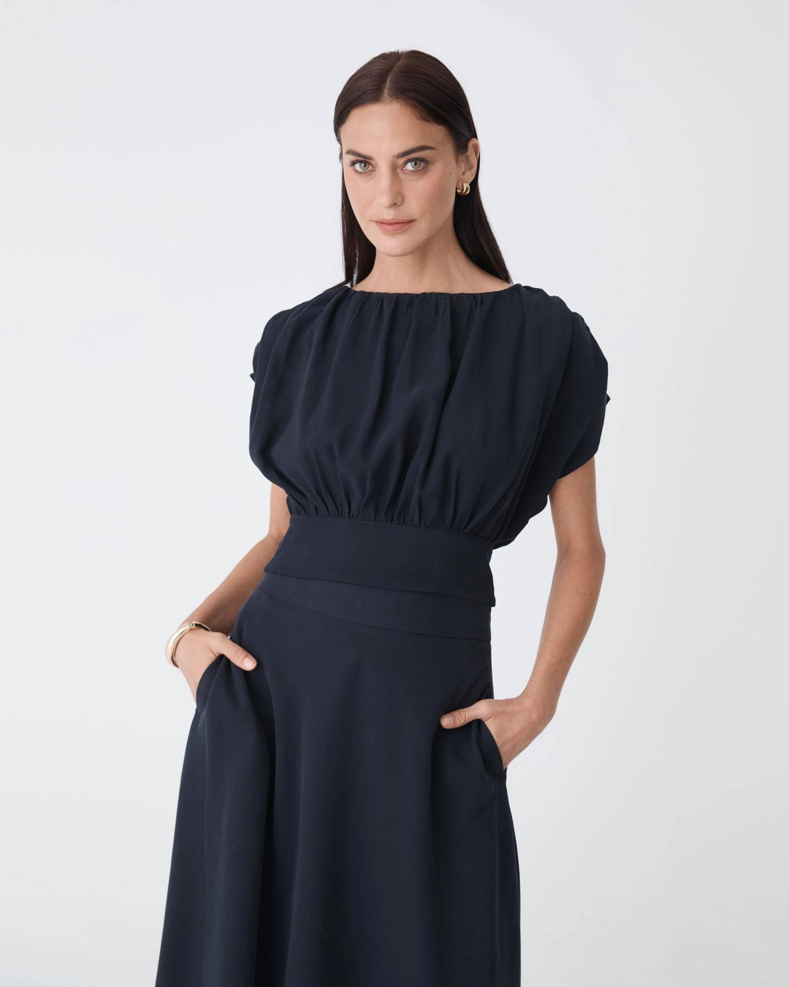 The Goulbury Tie Waist Top features a gathered boat neckline, a relaxed blouson bodice, and a waist wrap-tie that defines the shape. Finished with a wide, structured waistband for a secure fit, this top balances fluid drape with a cinched waist for a polished, feminine look. Pair it with high-waisted trousers or the matching Goulbury A-Line Midi Skirt for an easy, elevated outfit.
