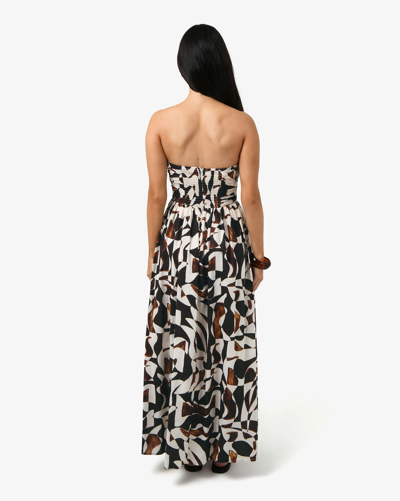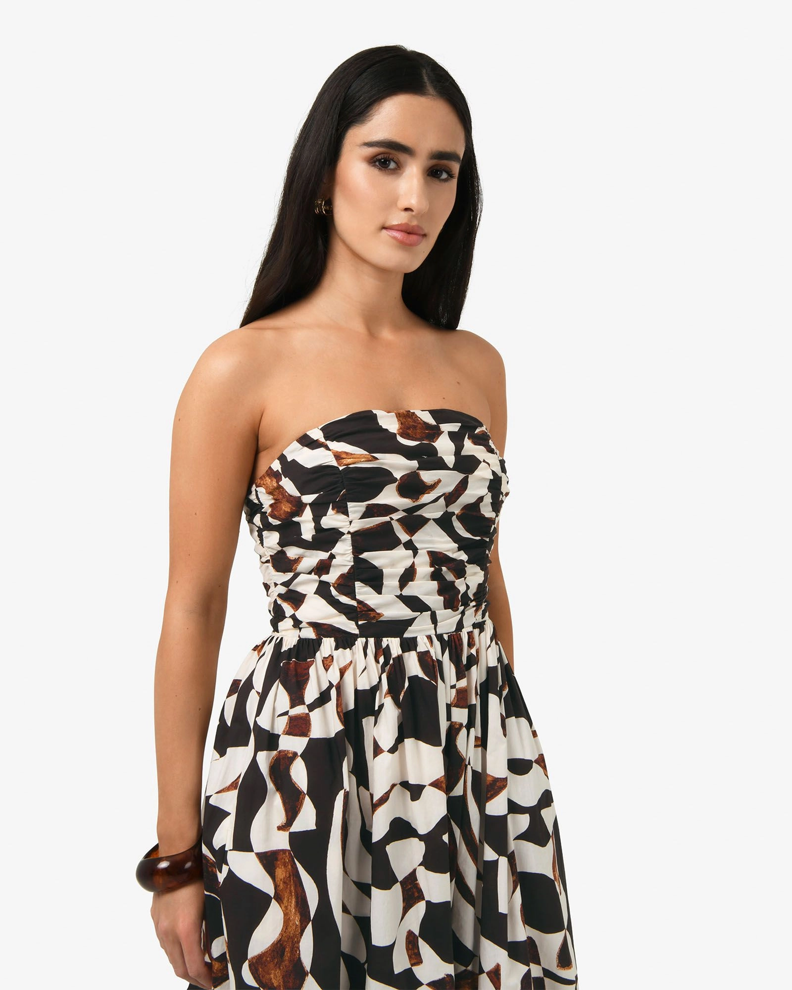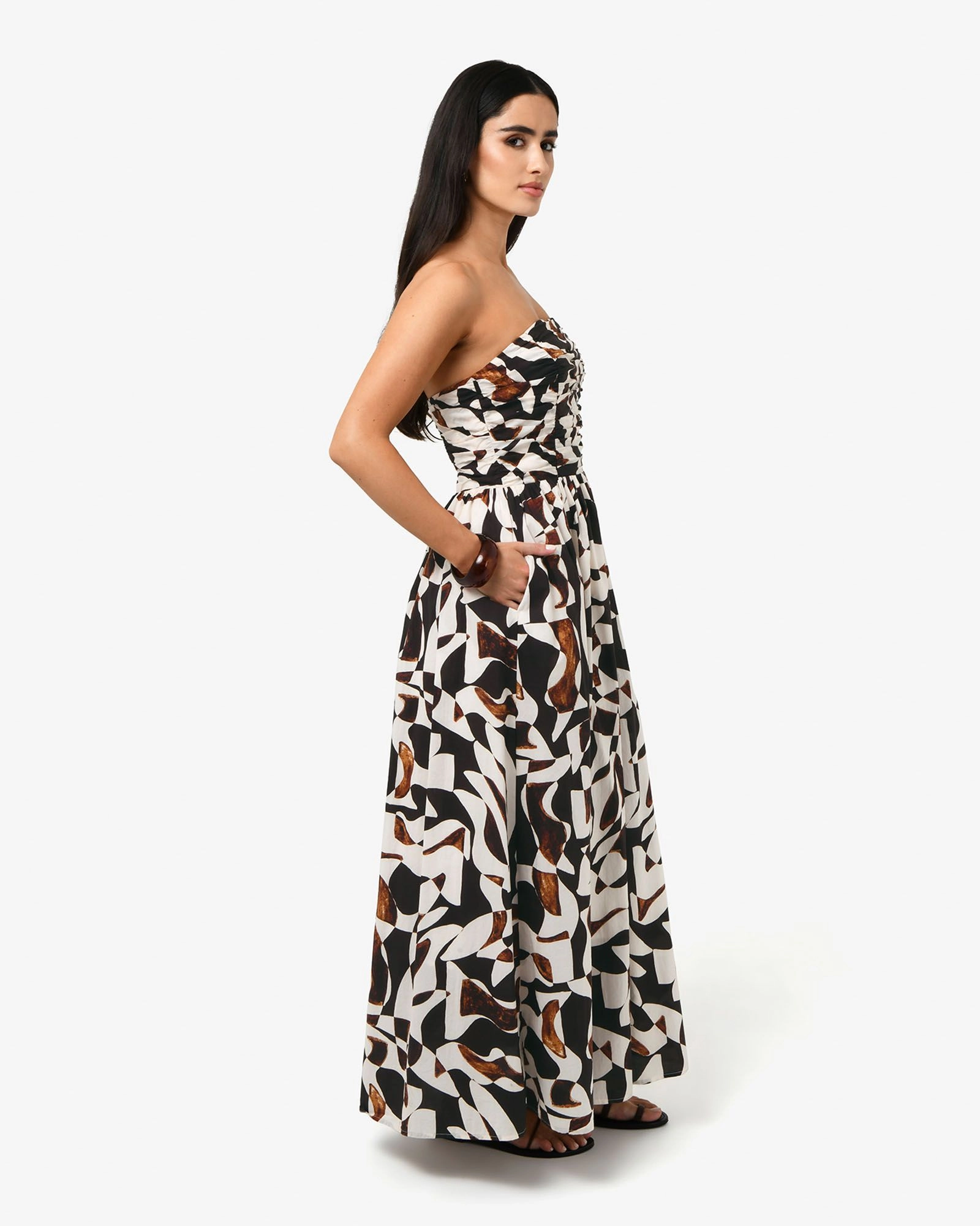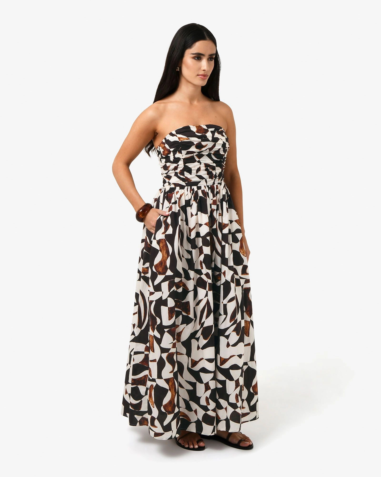Meet the Hazel Printed Strapless Dress, an elegant piece in 100% cotton for your special occasions and events. It features a bold abstract print, a ruched strapless bodice and a gathered waist that flows into an A-line maxi skirt. Style with statement accessories to complete your look.