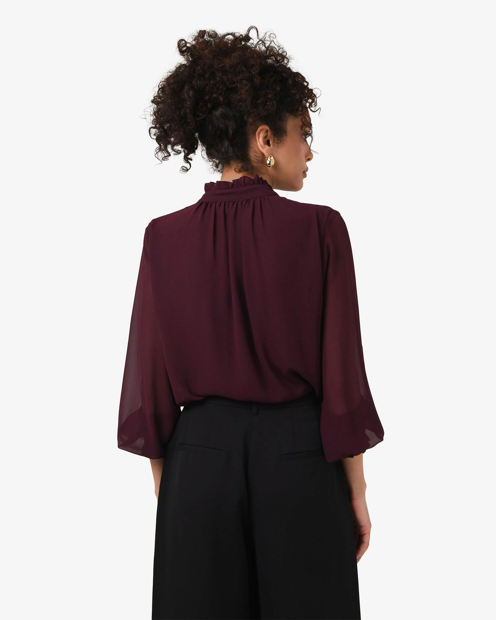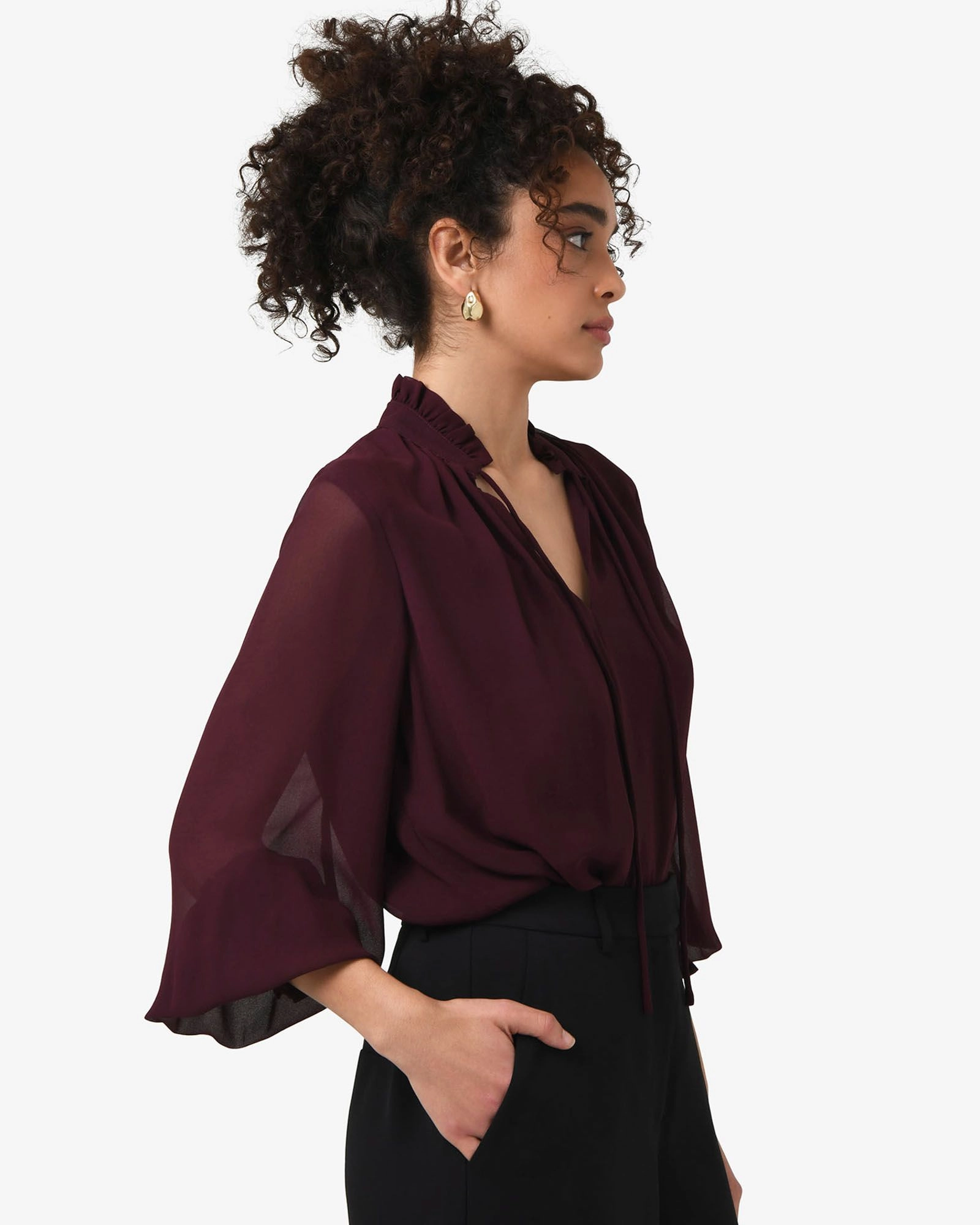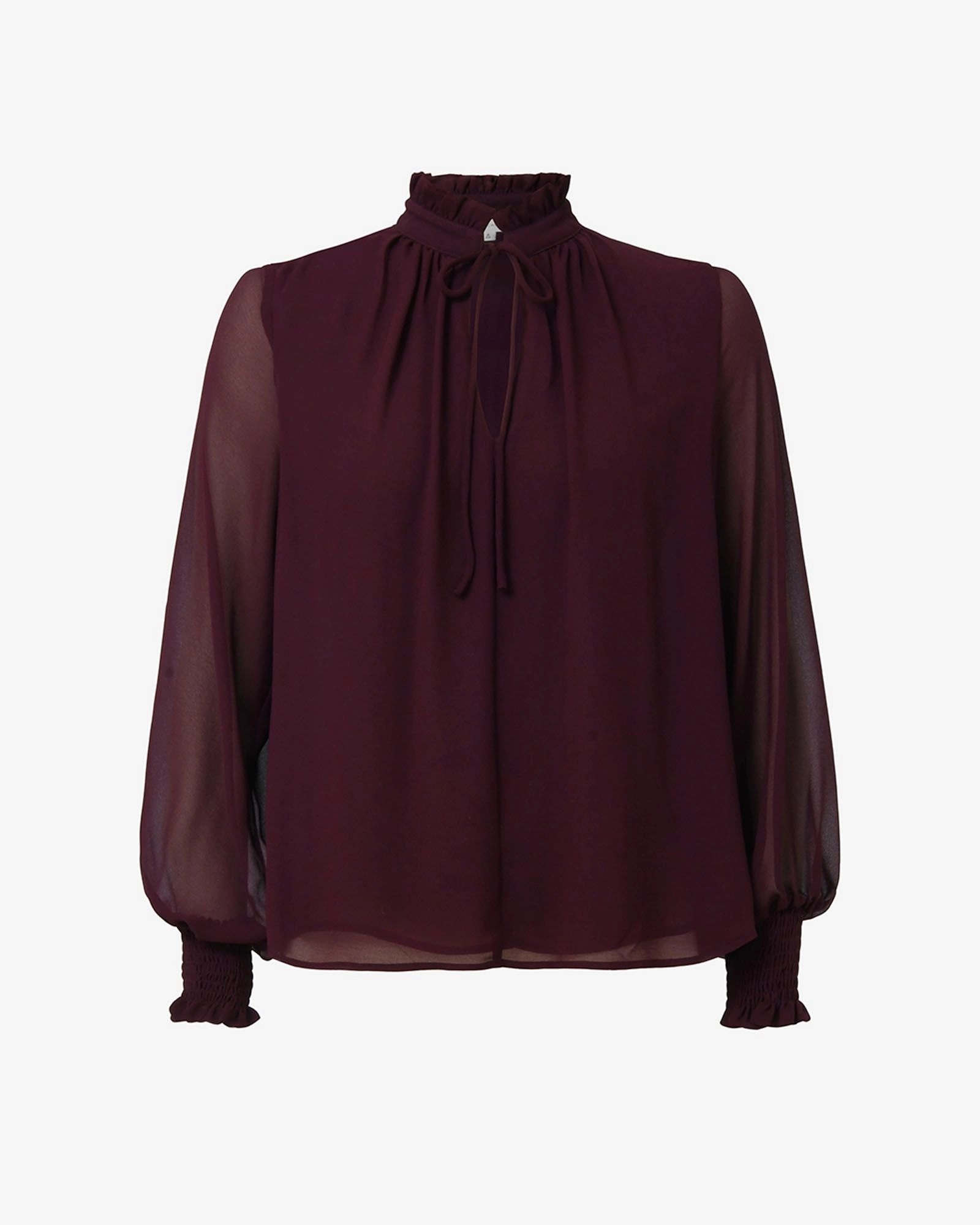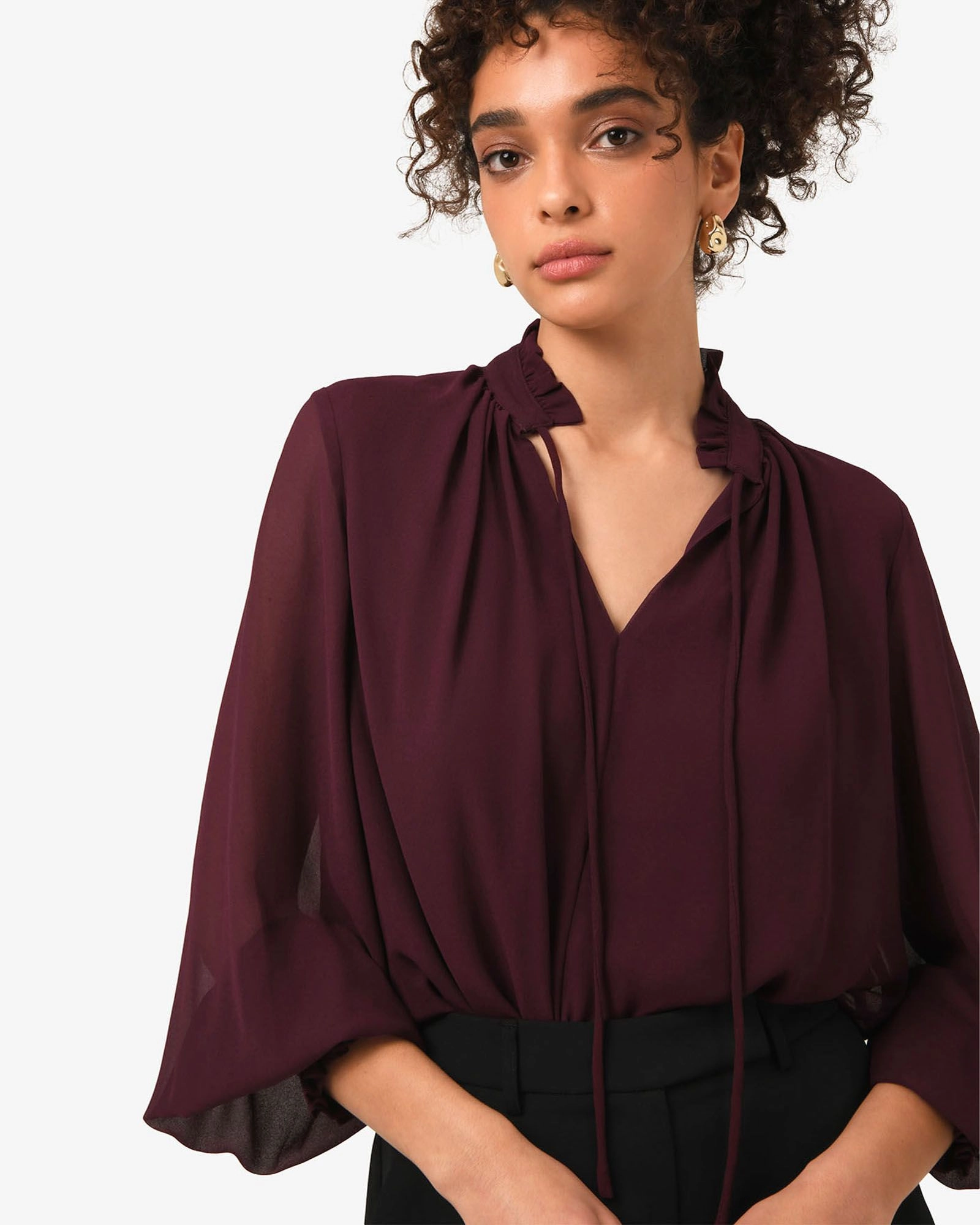 Made from airy, semi-sheer chiffon, the Joanna Chiffon Blouse offers a relaxed, comfortable fit with a graceful drape. Featuring a high ruffle mock neck and a tie-front keyhole opening for adaptable styling, it is finished with voluminous balloon sleeves and frill shirred cuffs. The blouse can be easily styled with pants and skirts.