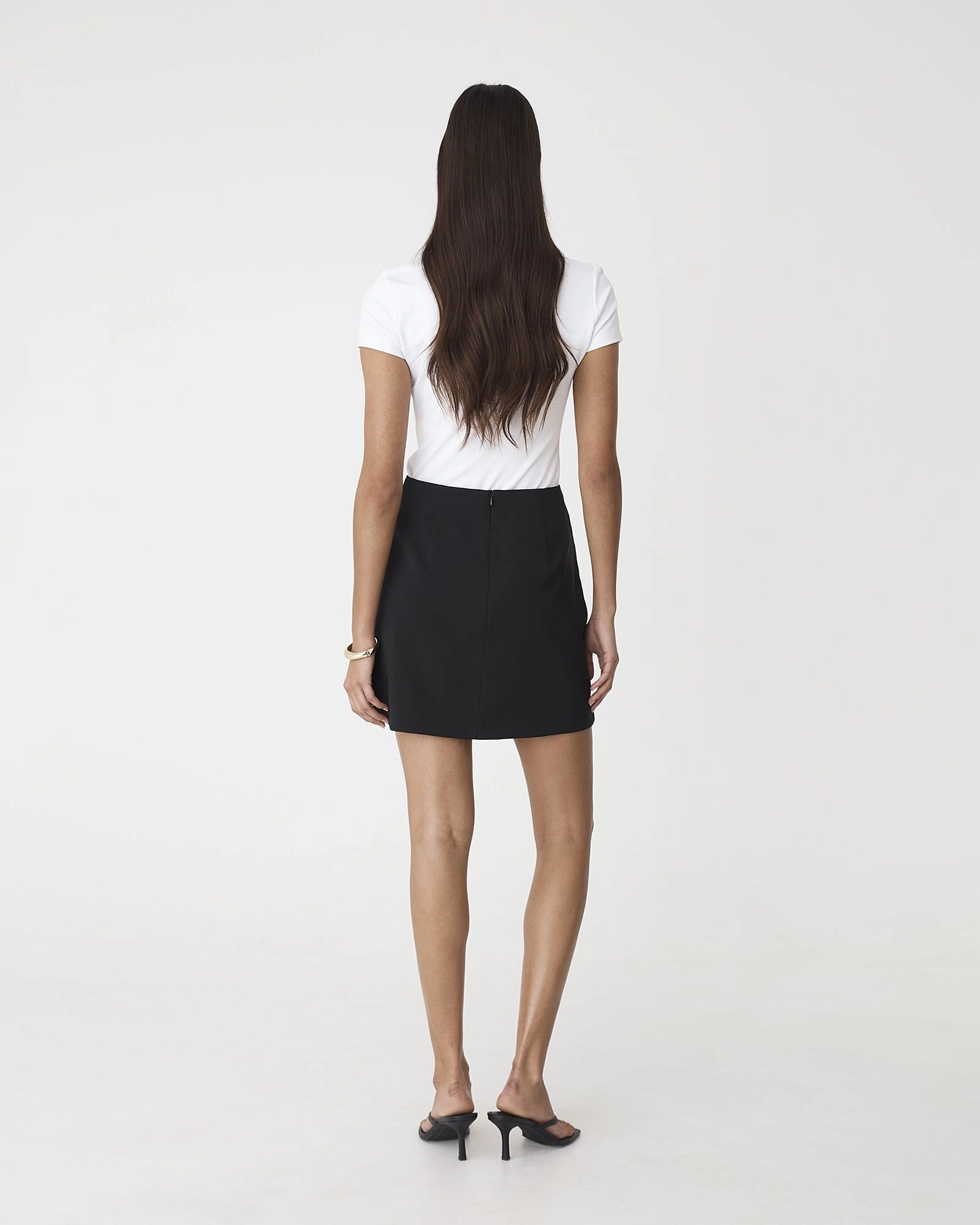 The Kinsley Tailored Mini Skirt features a structured A-line silhouette, high-rise waist, and functional front pockets with flaps, creating a polished look. It offers a flattering fit while maintaining shape and elegance. The skirt is versatile and can be styled with an off-shoulder top and heels for a chic weekend look or dressed for professional settings and casual settings alike.