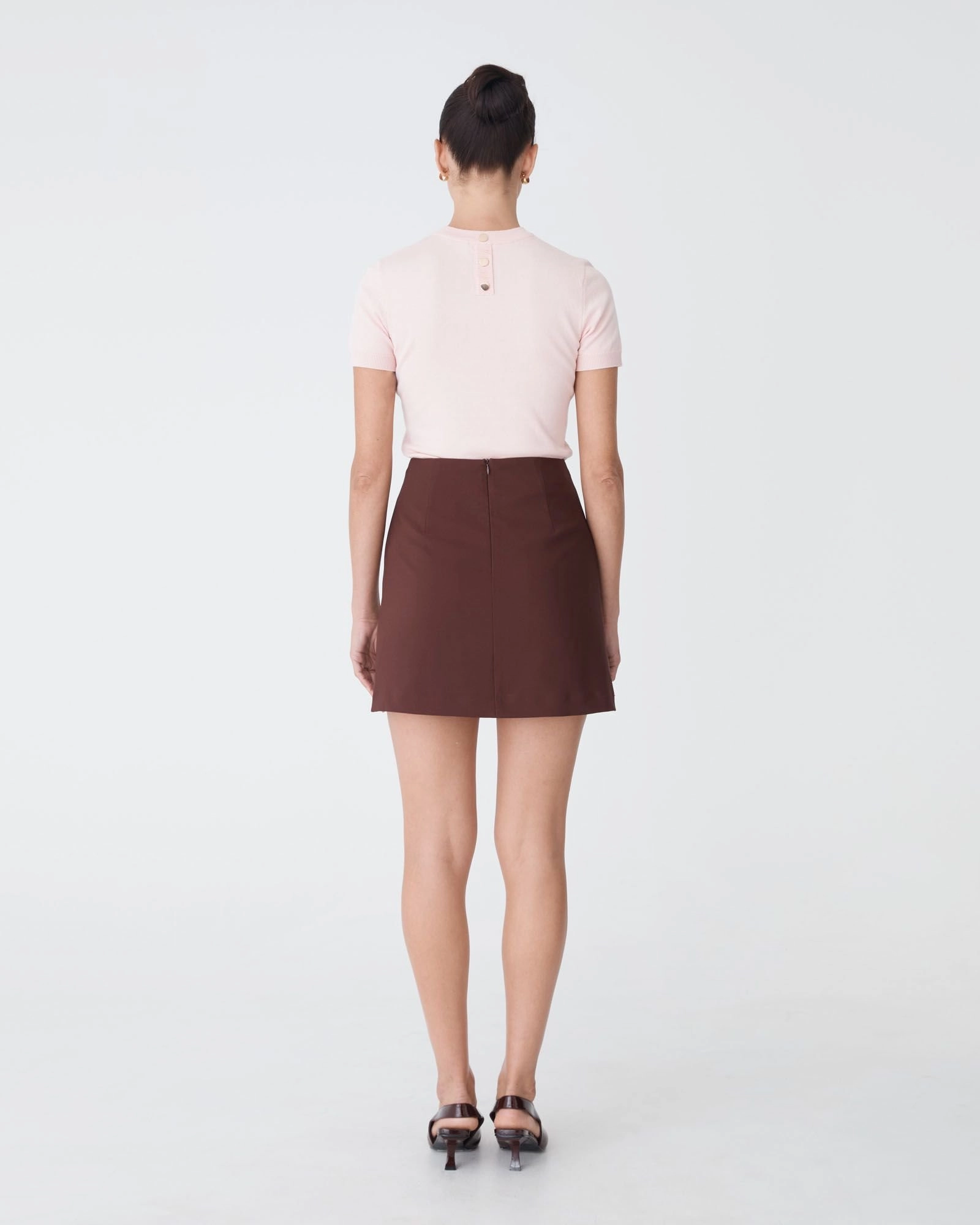 The Kinsley Tailored Mini Skirt features a structured A-line silhouette, high-rise waist, and functional front pockets with flaps, creating a polished look. It offers a flattering fit while maintaining shape and elegance. The skirt is versatile and can be styled with an off-shoulder top and heels for a chic weekend look or dressed for professional settings and casual settings alike.