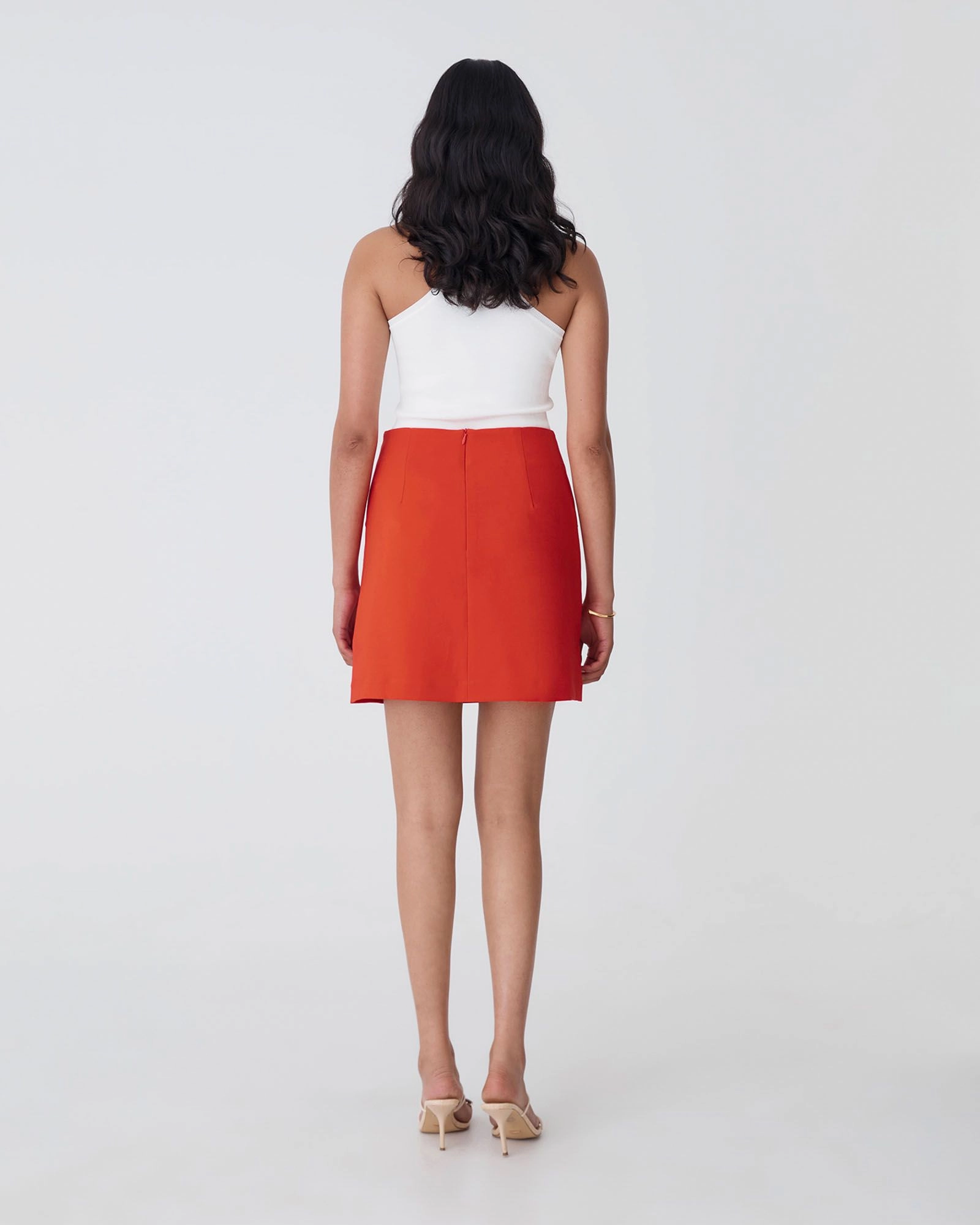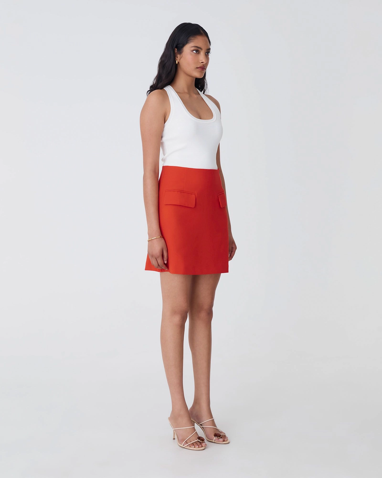 The Kinsley Tailored Mini Skirt features a structured A-line silhouette, high-rise waist, and functional front pockets with flaps, creating a polished look. It offers a flattering fit while maintaining shape and elegance. The skirt is versatile and can be styled with an off-shoulder top and heels for a chic weekend look or dressed for professional settings and casual settings alike.