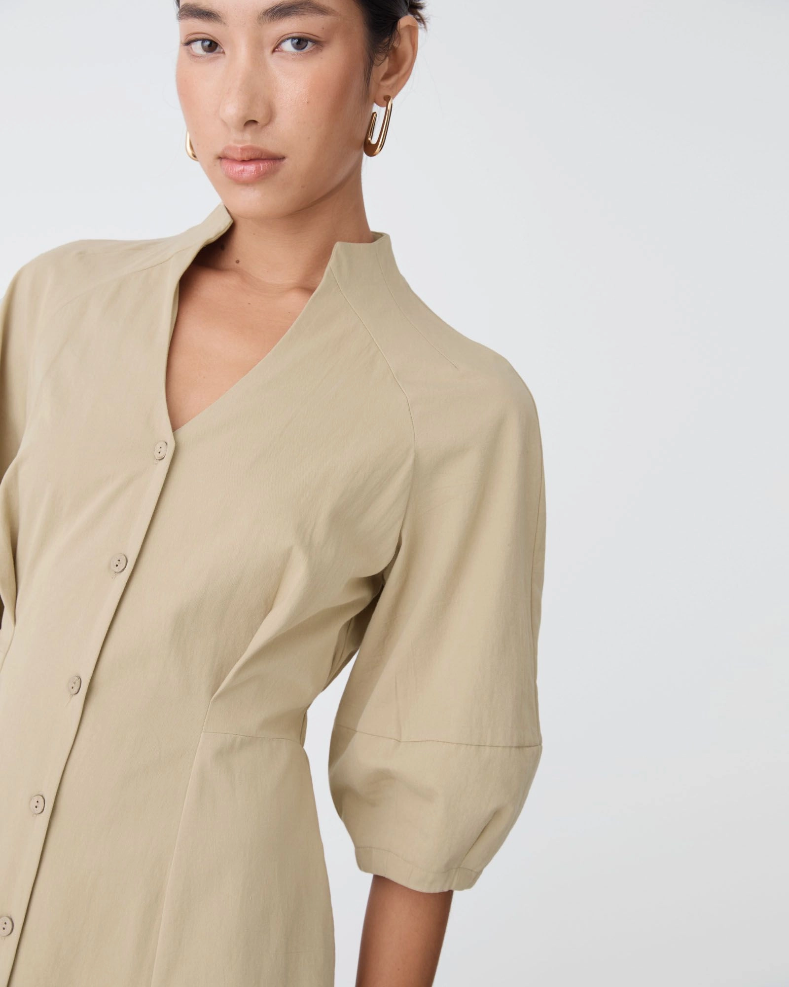 - Lantern sleeves with structured cuffs
