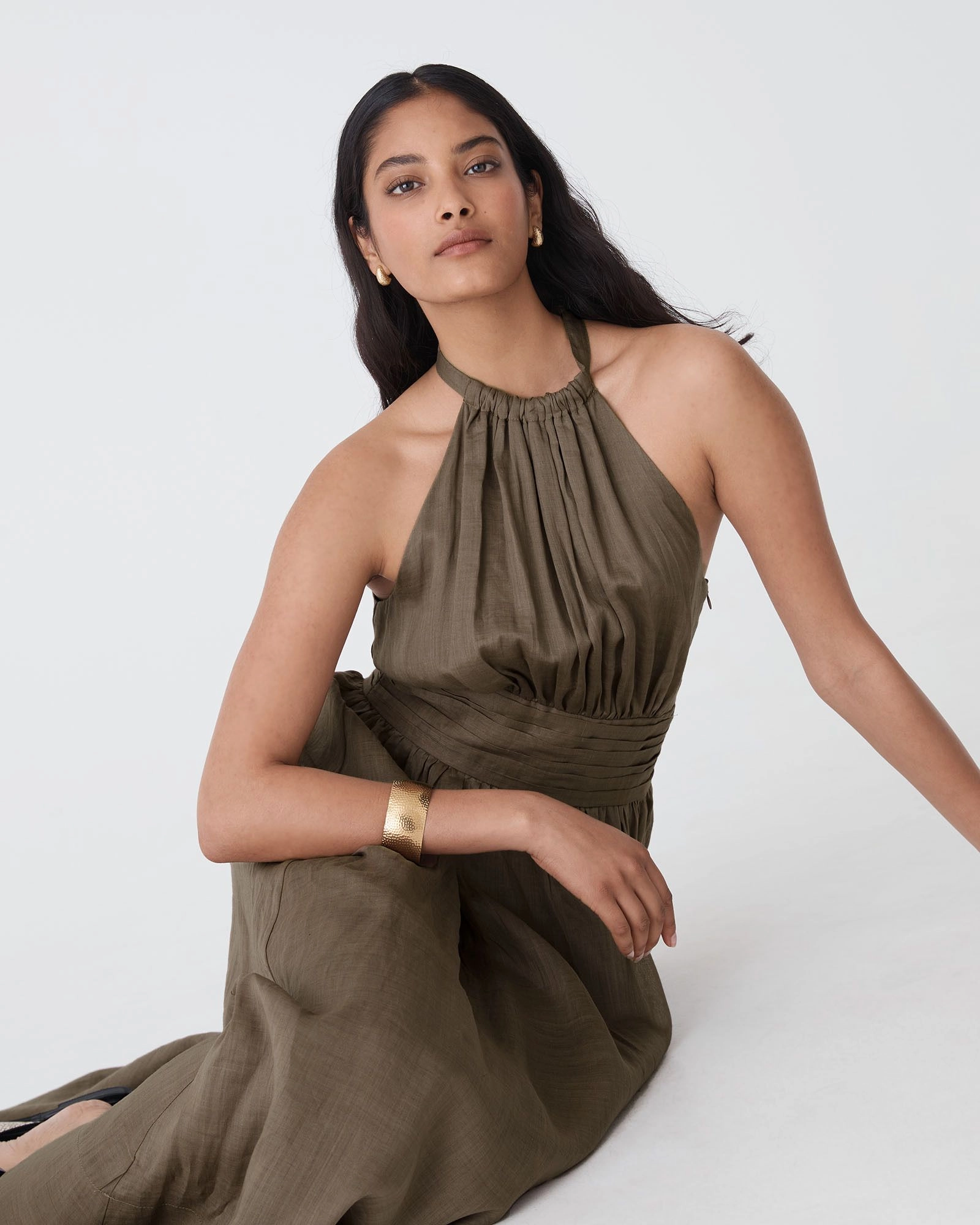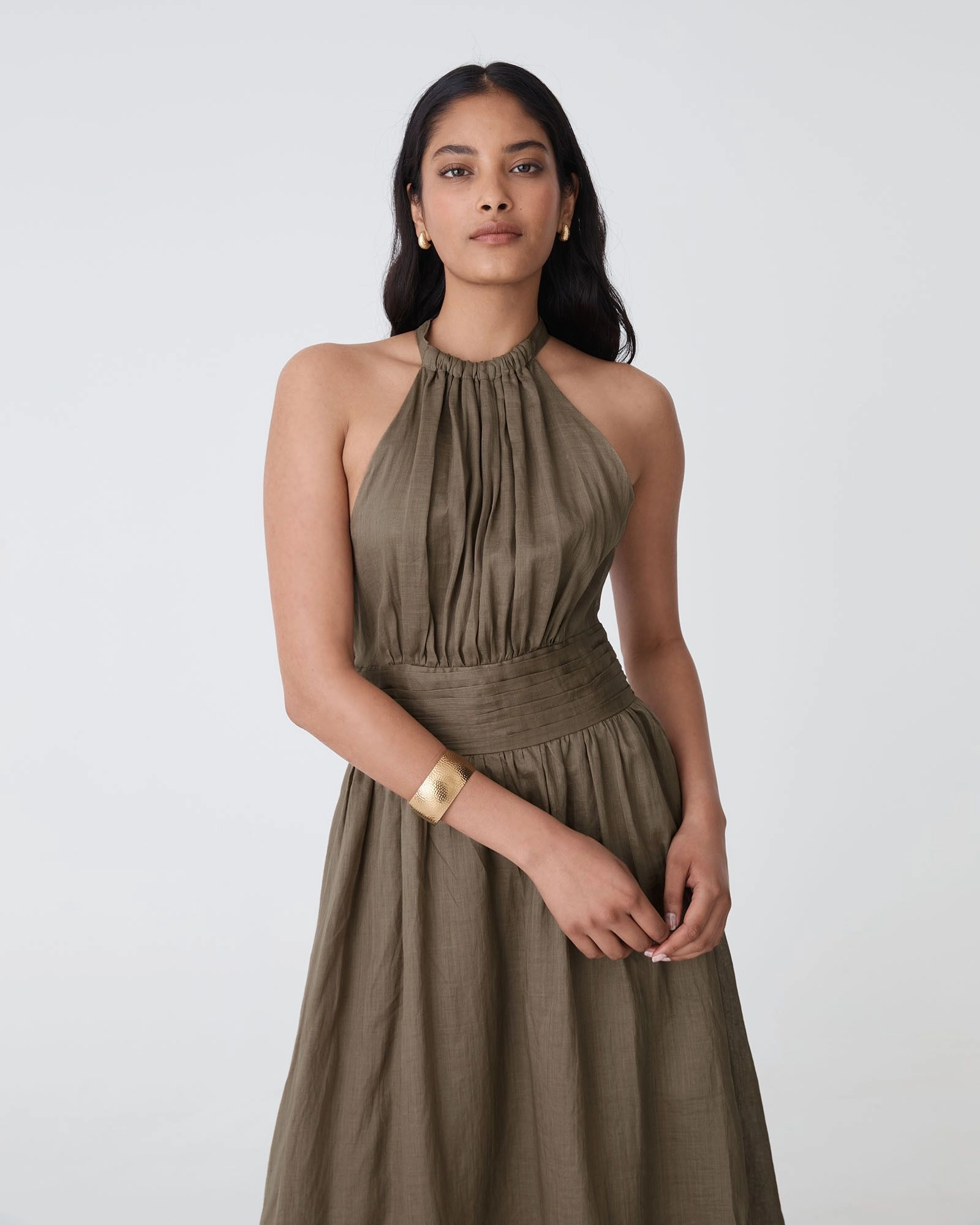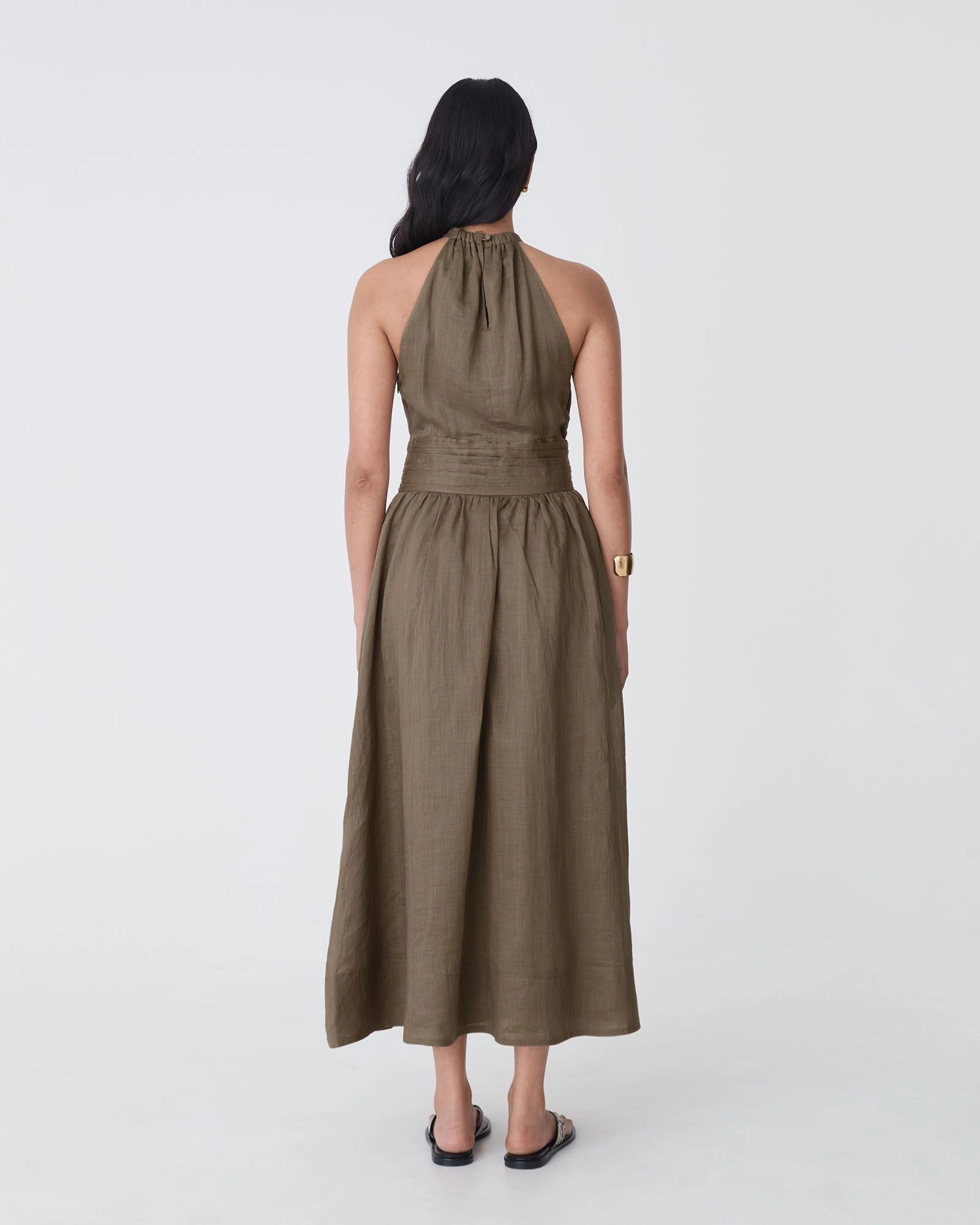 The Miami Gathered Neck Dress features a high, gathered, halter neckline, centre-back keyhole with a loop button closure, wide pleated waistband, and a full flowing maxi skirt in ramie fabrication. It offers a flattering, comfortable silhouette - suitable for all warm-weather events. Pair with heels and statement jewellery to complete your look.