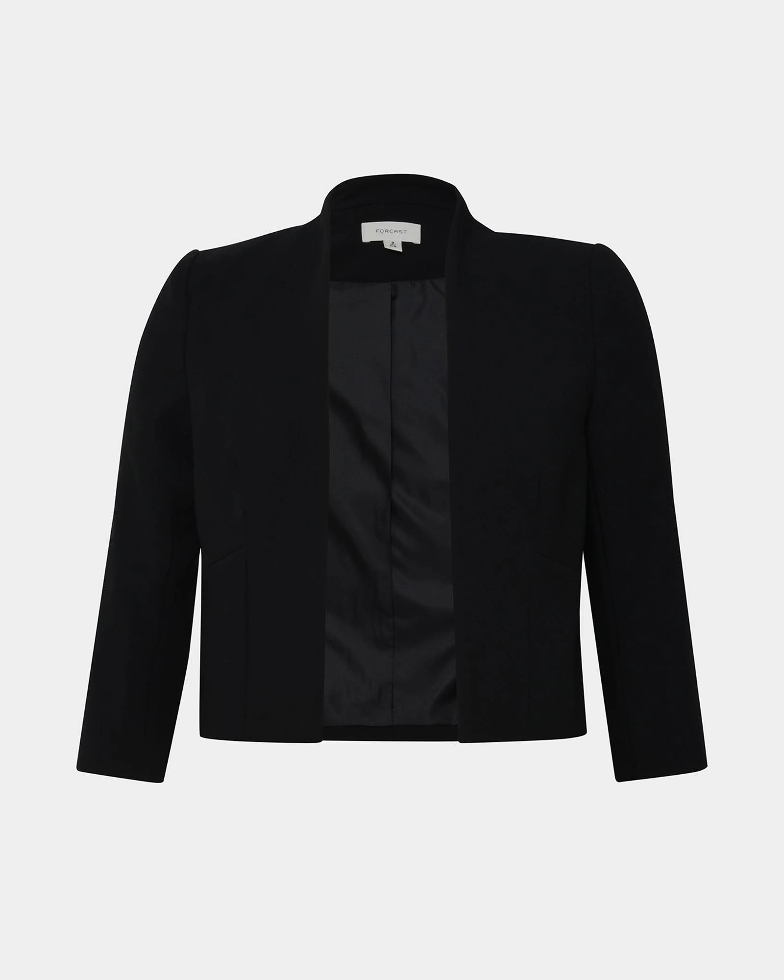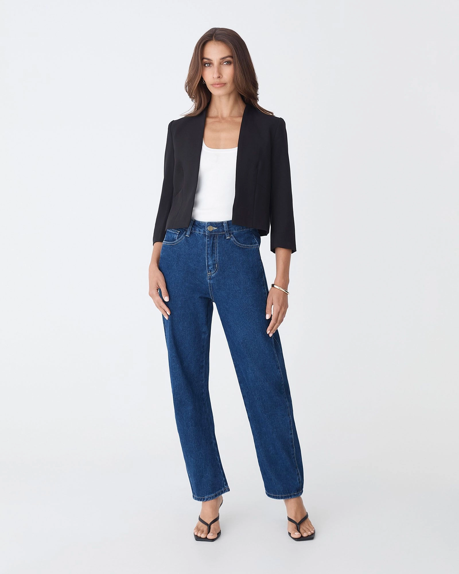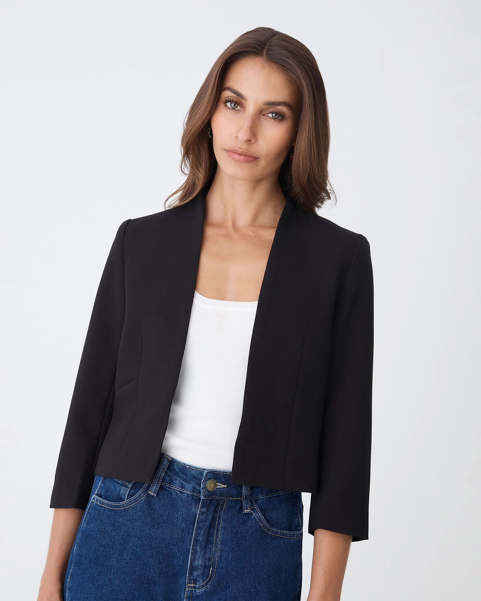 Meet the Nikki Collarless Crop Jacket, featuring a sleek, collarless neckline and a cropped silhouette. Its ¾ sleeves are perfect for transeasonal weather and provide comfort throughout the day. Ideal for layering, it pairs effortlessly with dresses, skirts, or jeans for a polished, put-together look on any occasion.