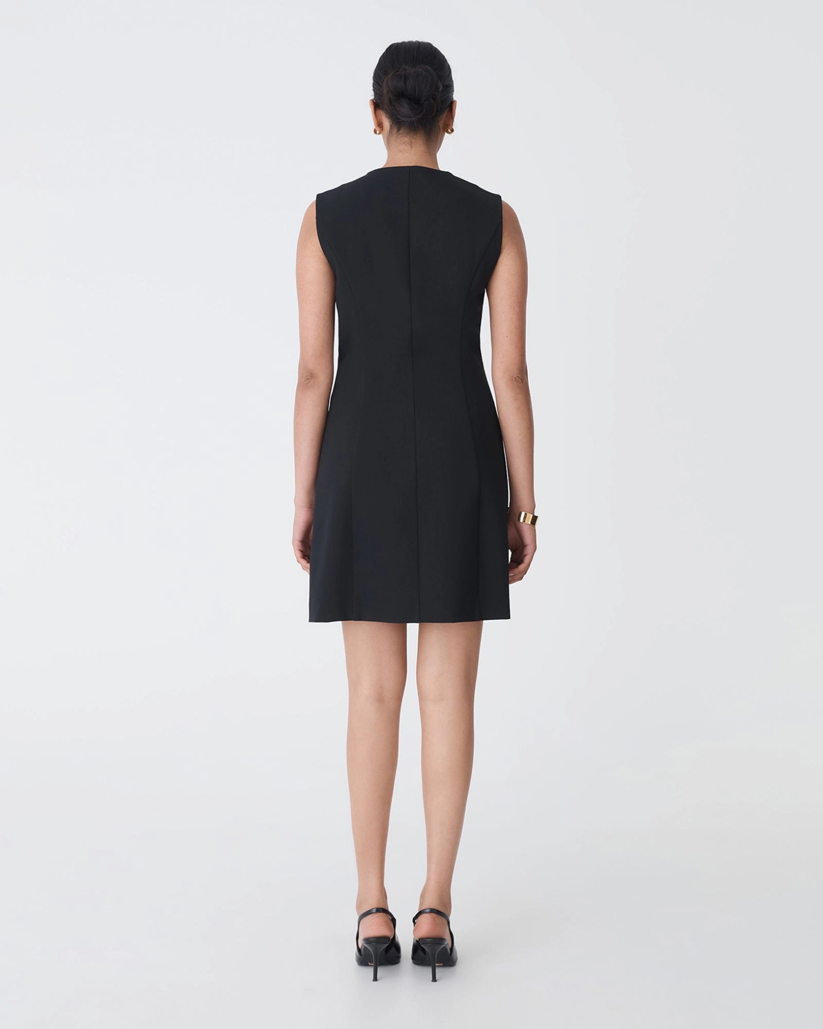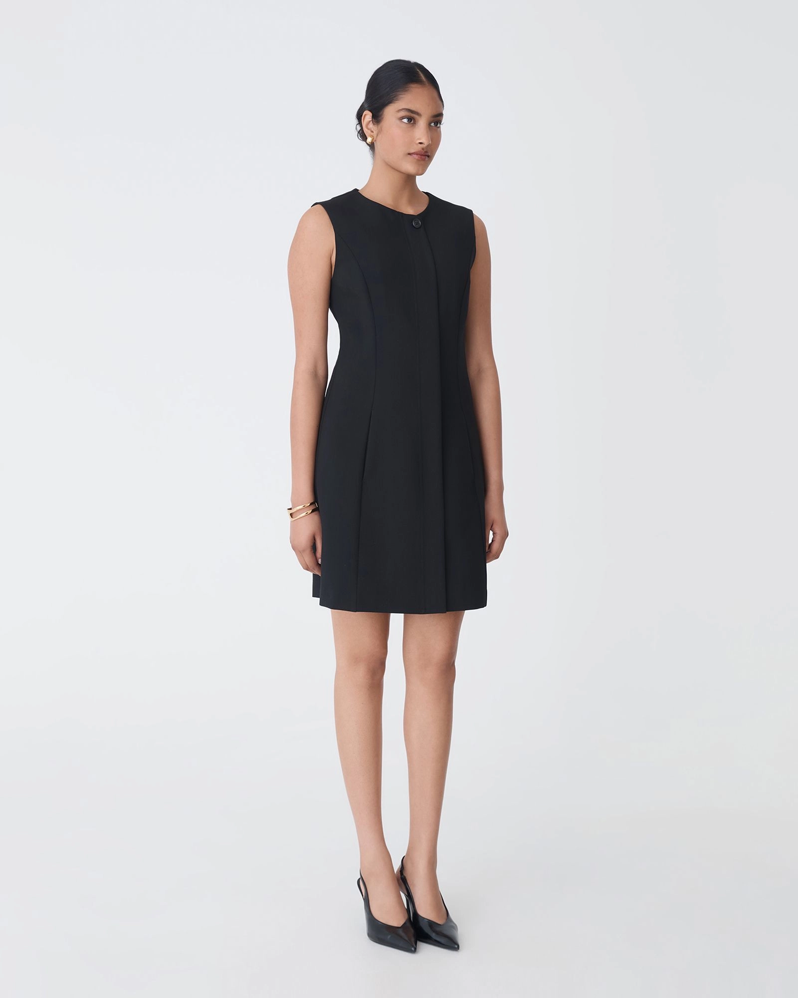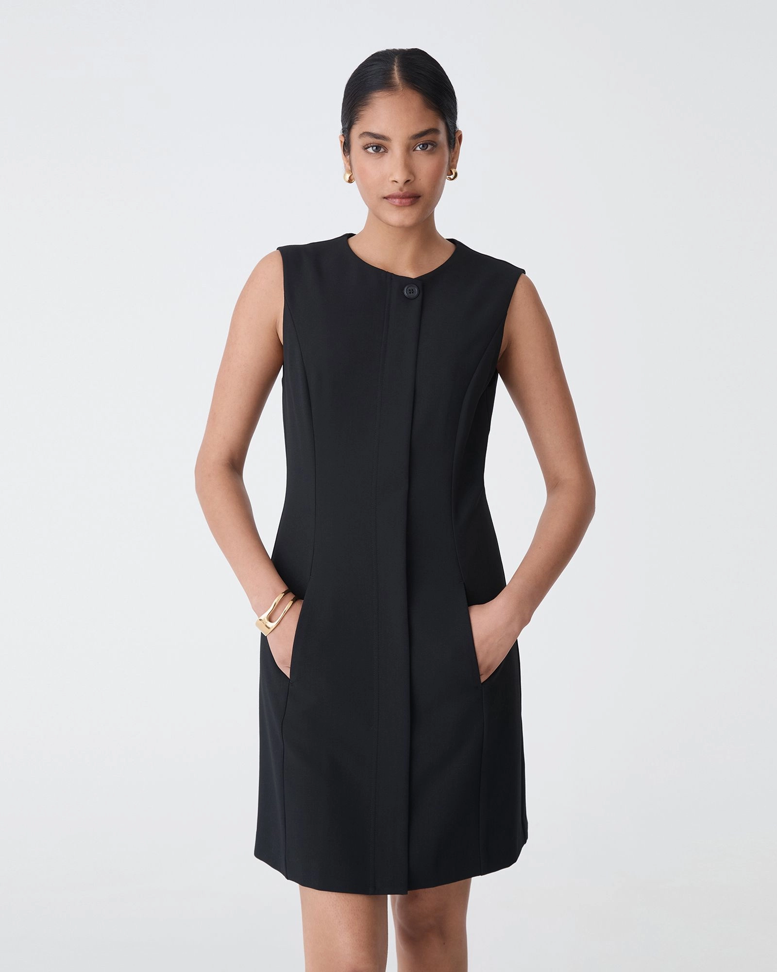 The Pera Concealed Panel Dress is a sleek, tailored style designed for easy, polished wear. Featuring a concealed zip front and subtle panel detailing, it creates a smooth, slim silhouette. The sleeveless cut and classic round neckline make it perfect for the office or off-duty occasions. Style with heels or statement accessories to complete the look.