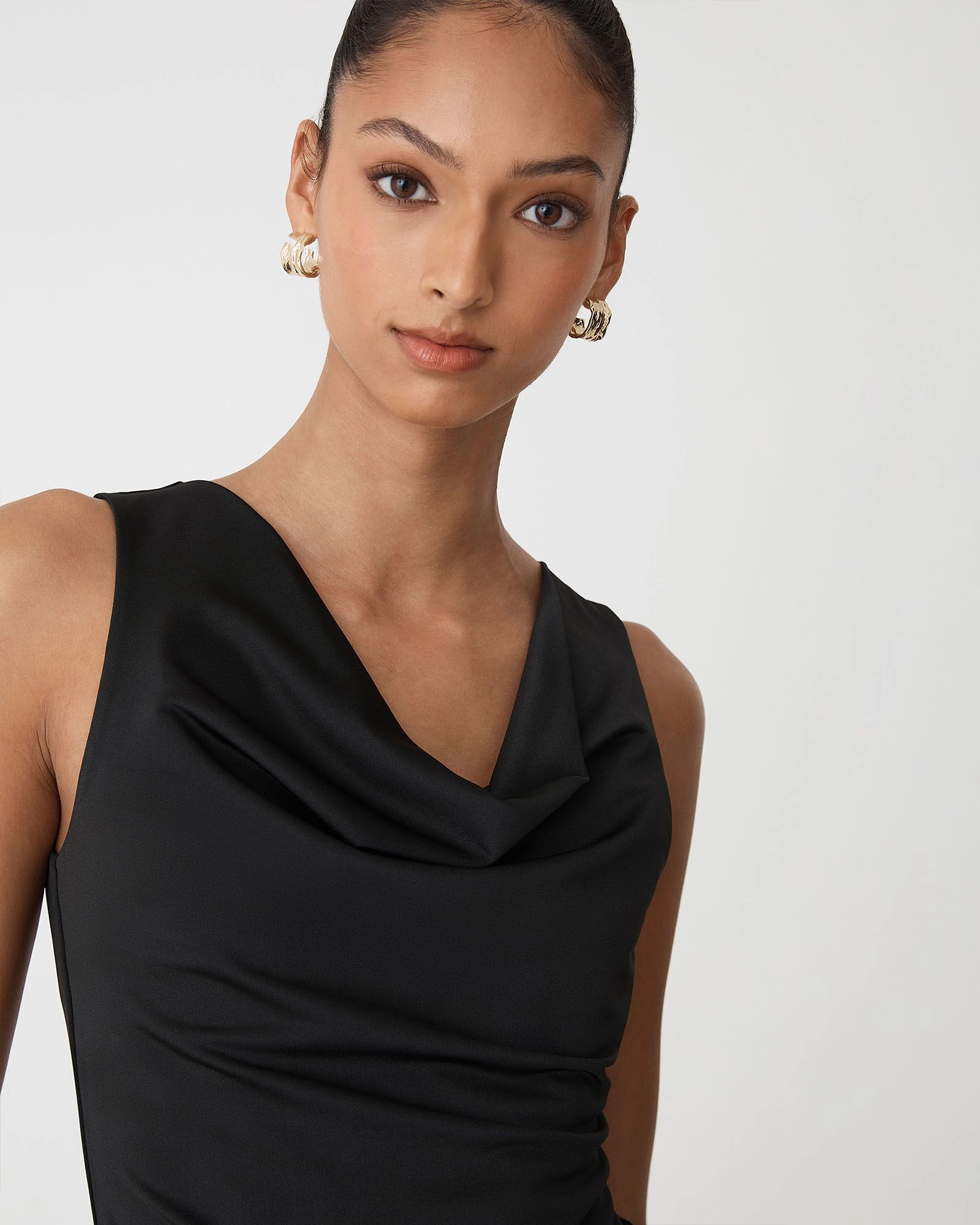Introducing the Sabrina Cowl Neck Top, a piece designed to elevate your wardrobe. Crafted from lustrous, satin-like fabric, it features a softly draped cowl neckline and a sleek sleeveless silhouette. Perfect for dressing up with wide leg pants or skirts.