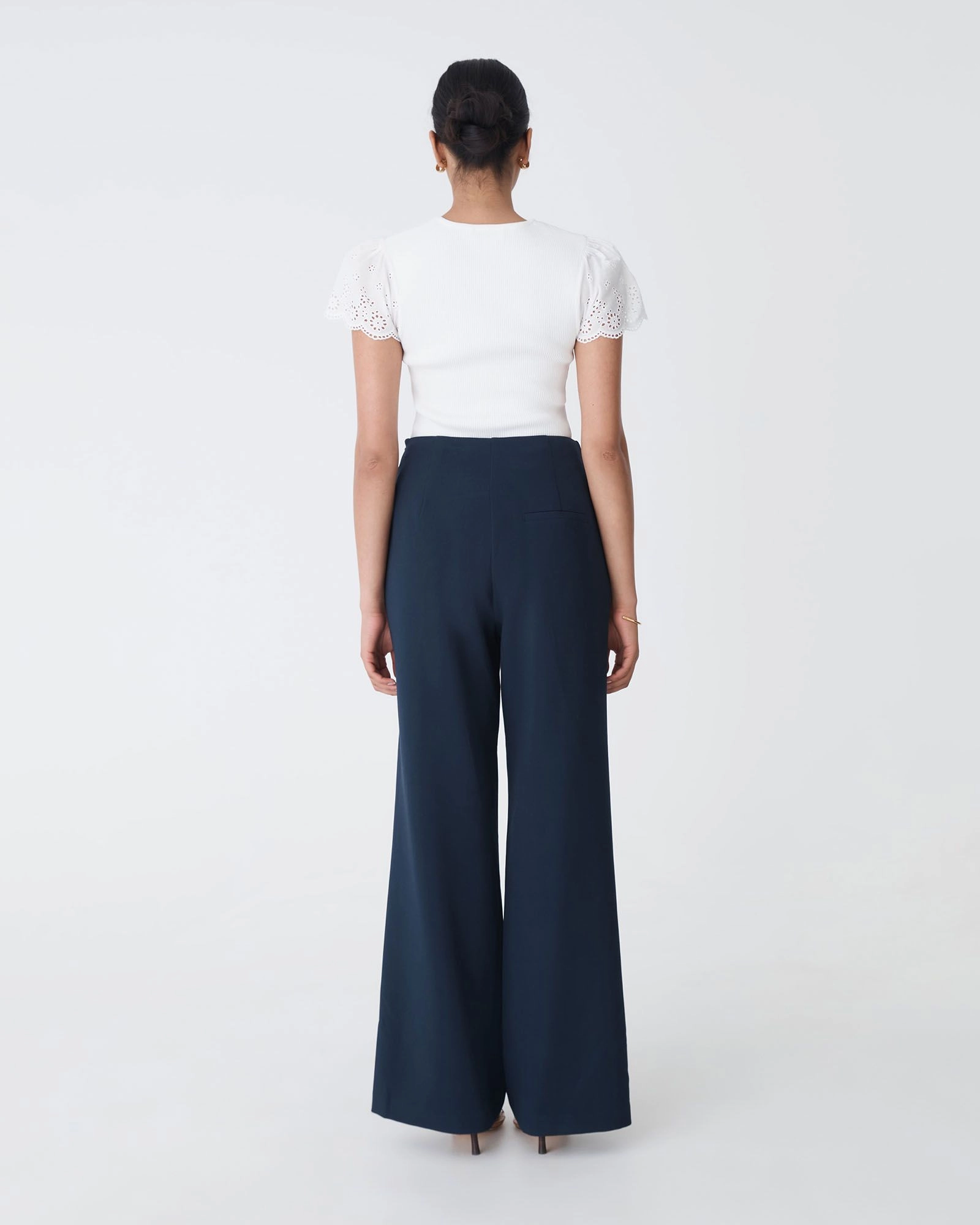 Soft and feminine, the Sasha Embroidery Knit Top features a soft ribbed knit body with a flattering fitted shape, finished with eyelet-embroidered flutter sleeves and delicate scalloped edges. Designed with a classic crew neckline, it offers a flattering silhouette that tucks neatly into skirts or trousers for an easy, polished look.